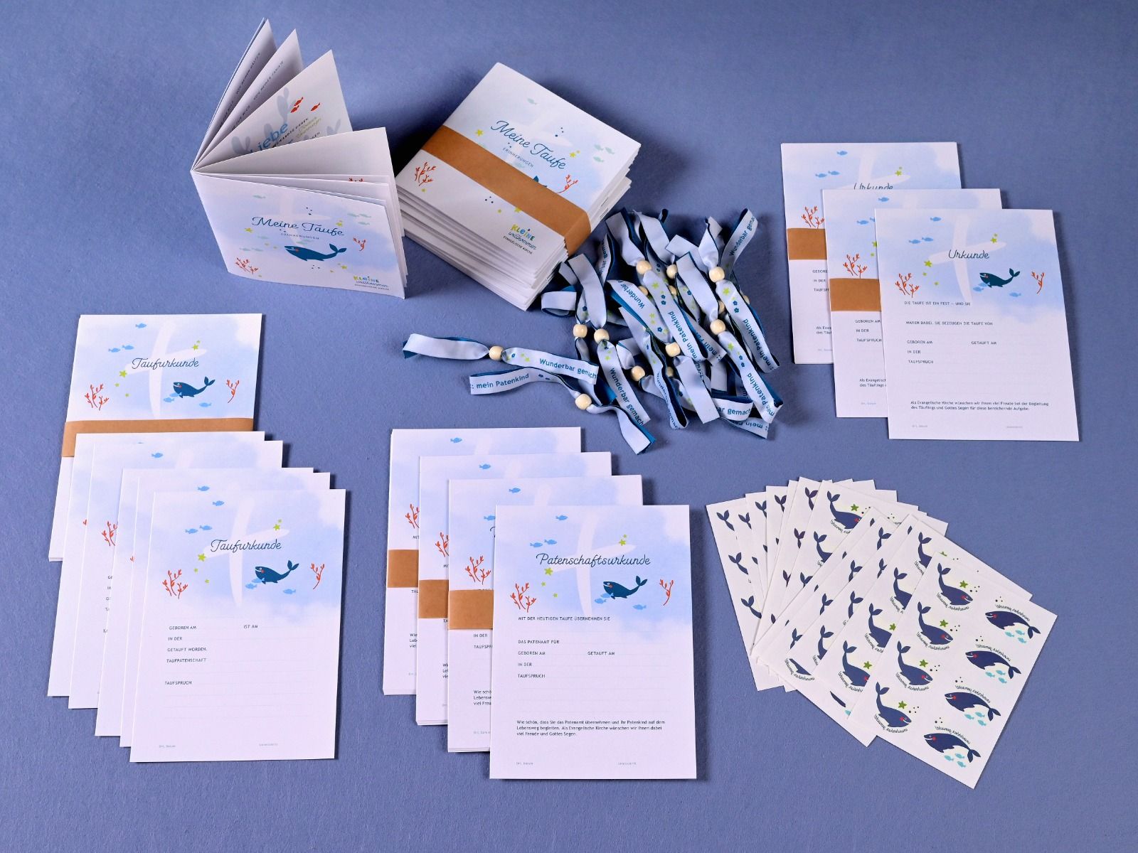 - 15 Taufurkunden, 30 Patenschaftsurkunden, 20 Urkunden für Taufzeug*innen mit Motiv “Wal”