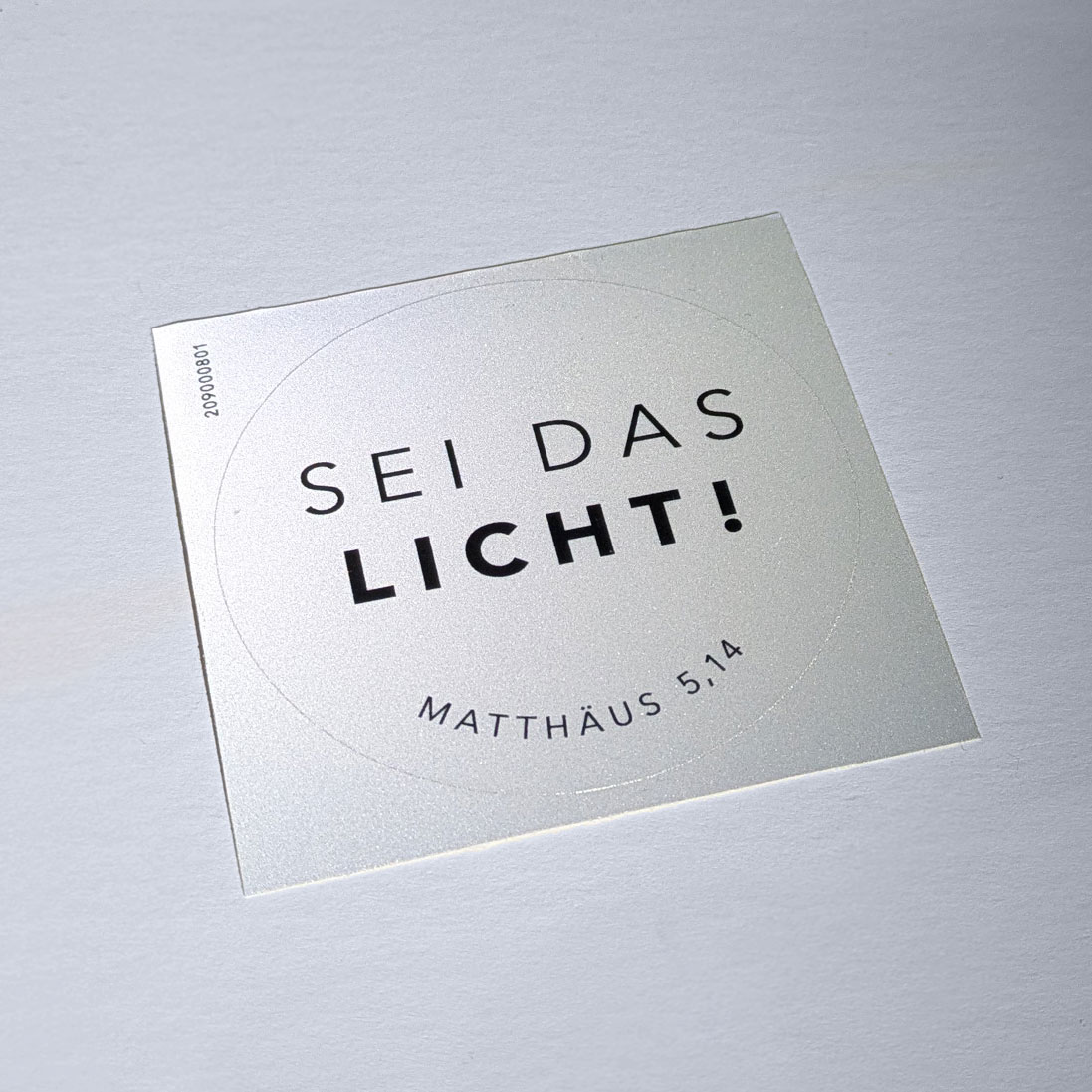 Der runde Reflektor-Aufkleber „Sei das Licht!“ ist ein besonderer Hingucker für die dunkle Jahreszeit.